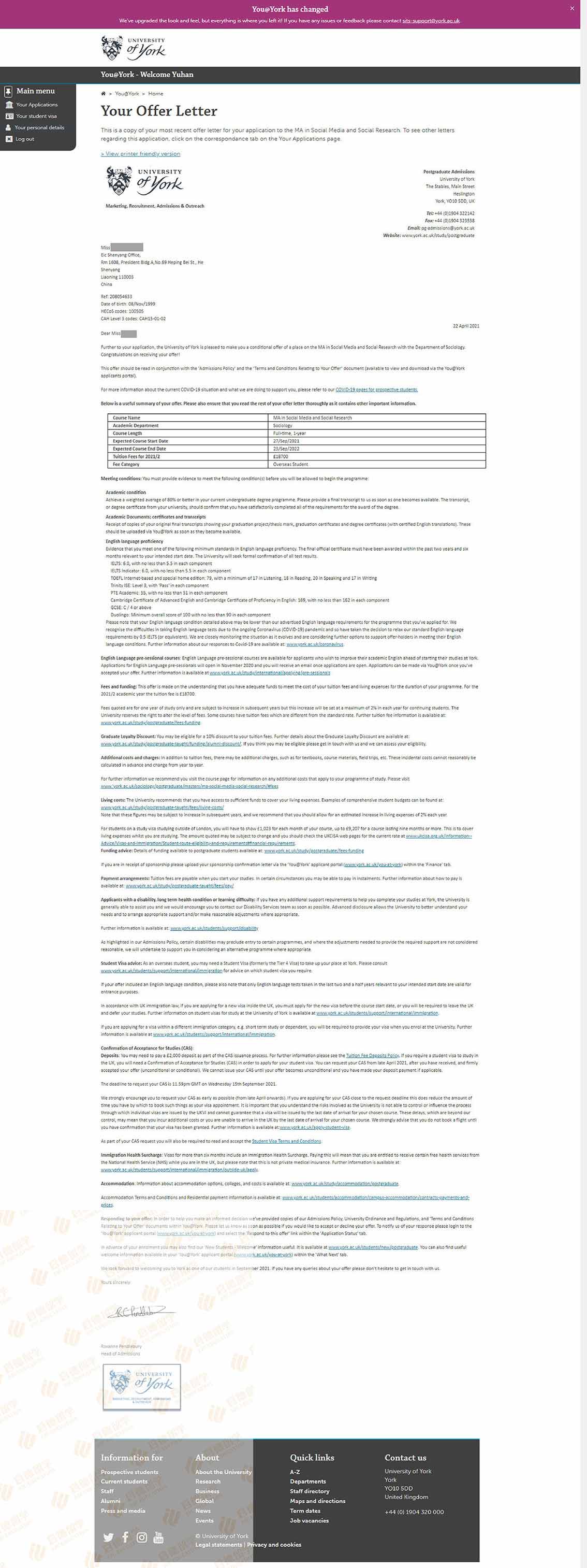 录取院校:约克大学