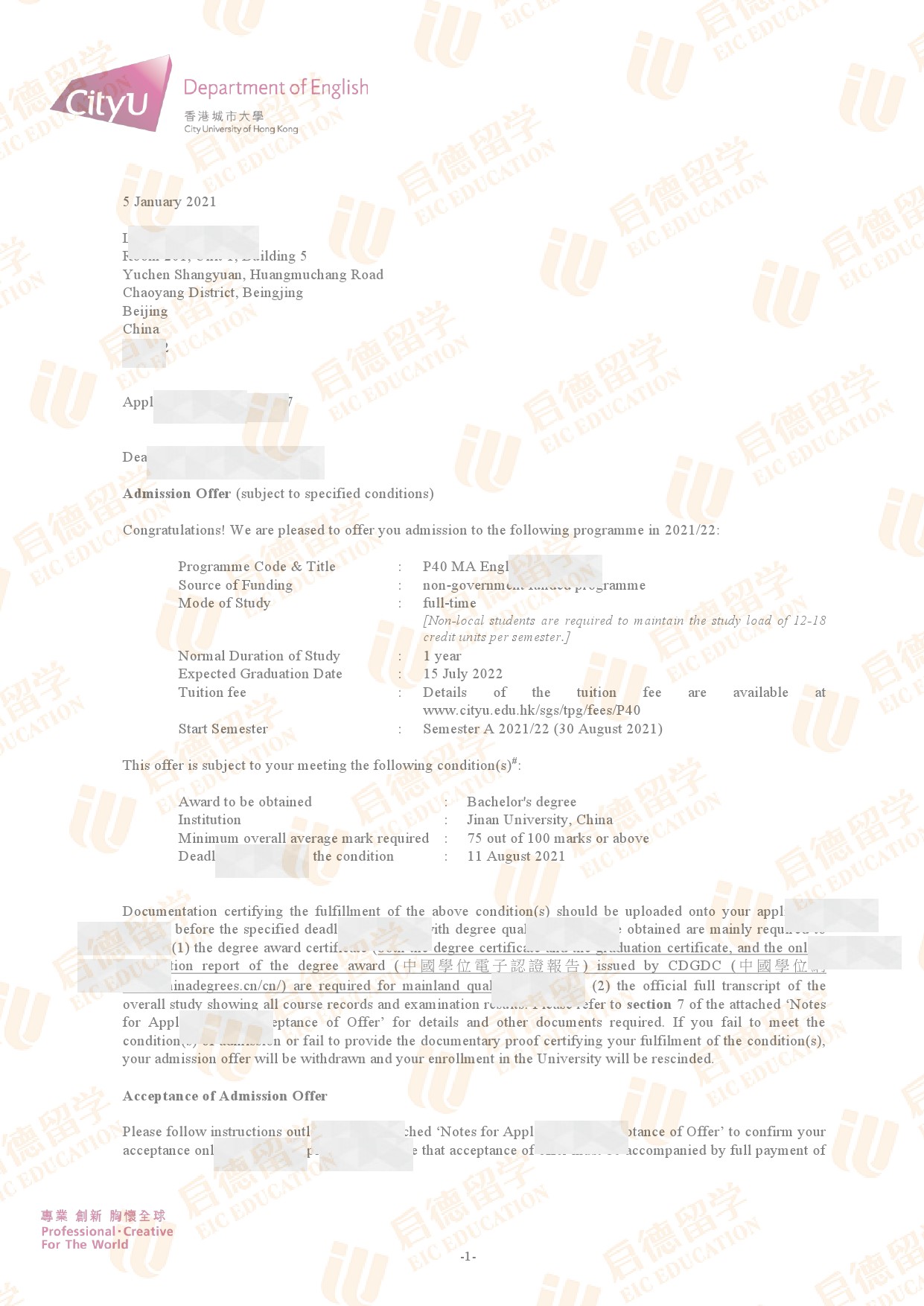 录取专业:MA English Studies (Literature, Language and Culture Stream)