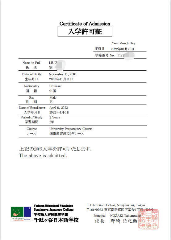 录取院校:千驮谷日本语学校