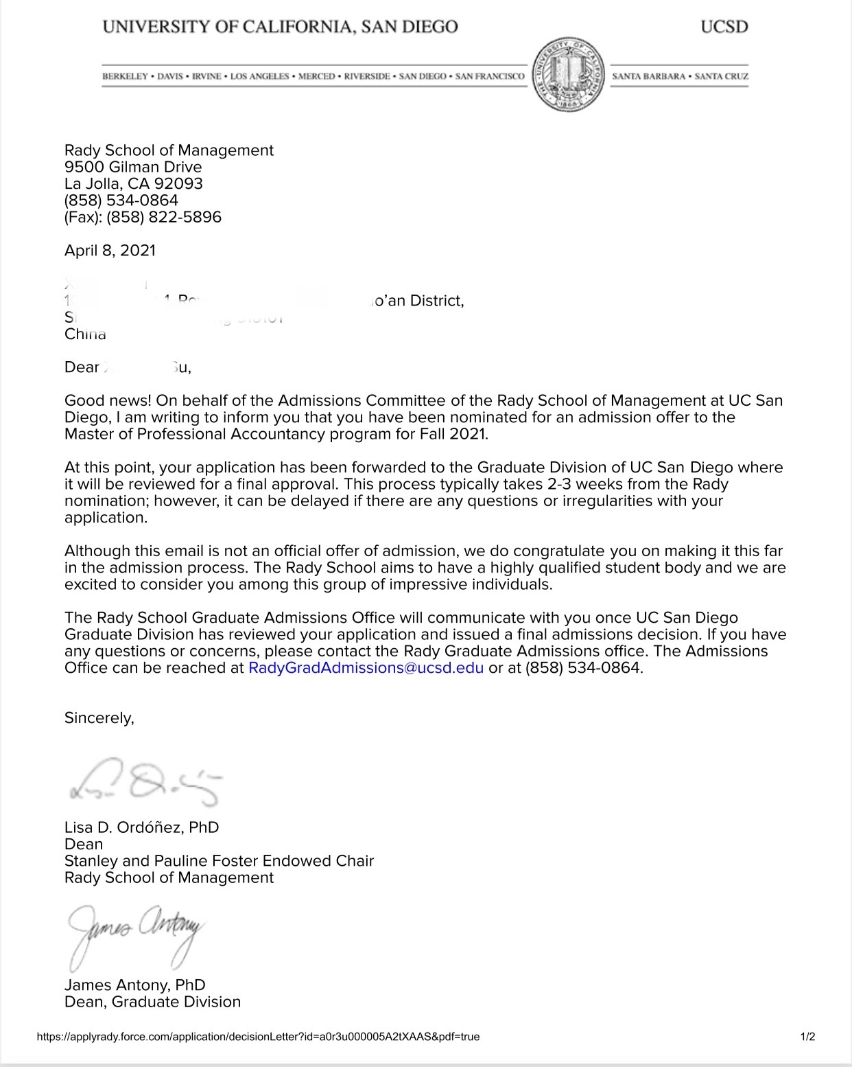 录取院校:加州大学圣地亚哥分校
