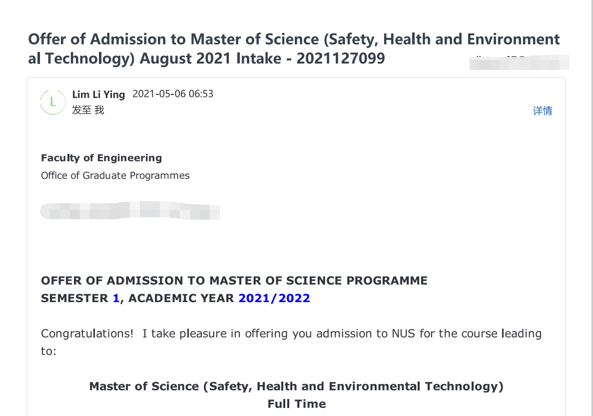 录取专业:Master of Science (Safety, Health and Environmental Technology)
