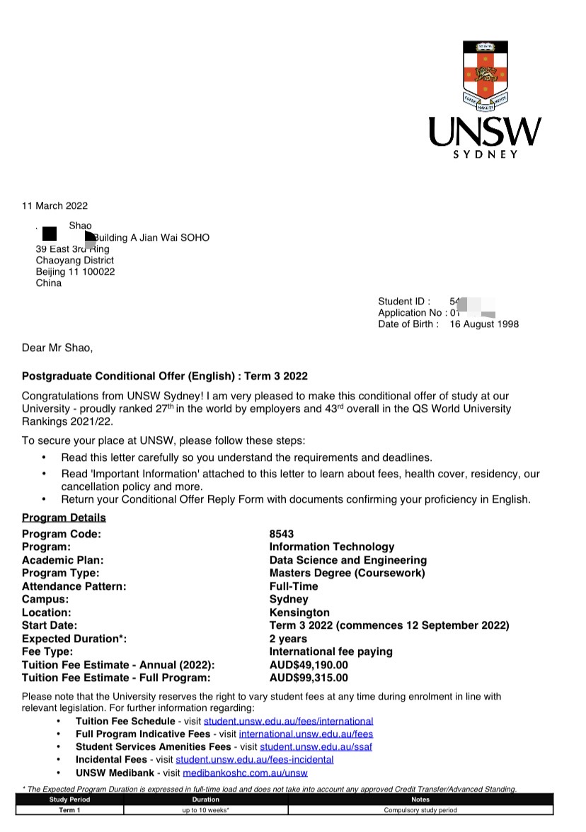 录取专业:Master of Information Technology(Data Science and Engineering)
