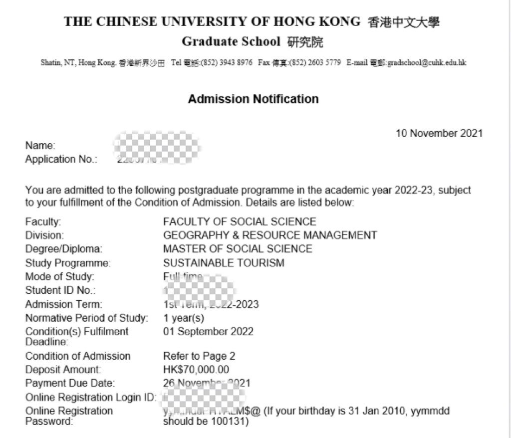 录取院校:香港中文大学