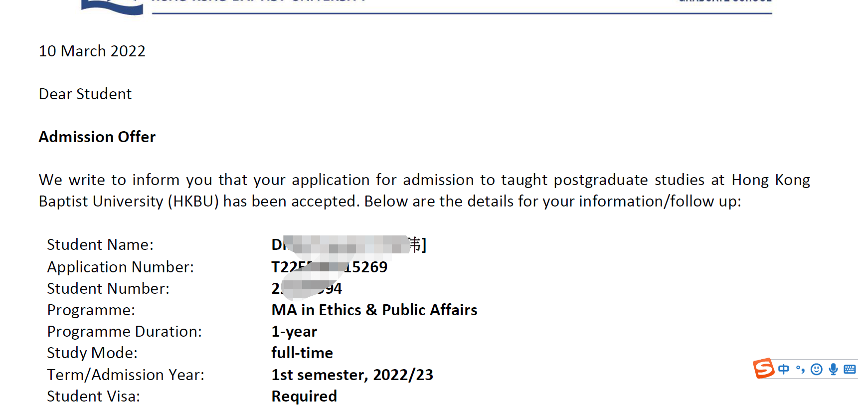 录取院校:香港浸会大学