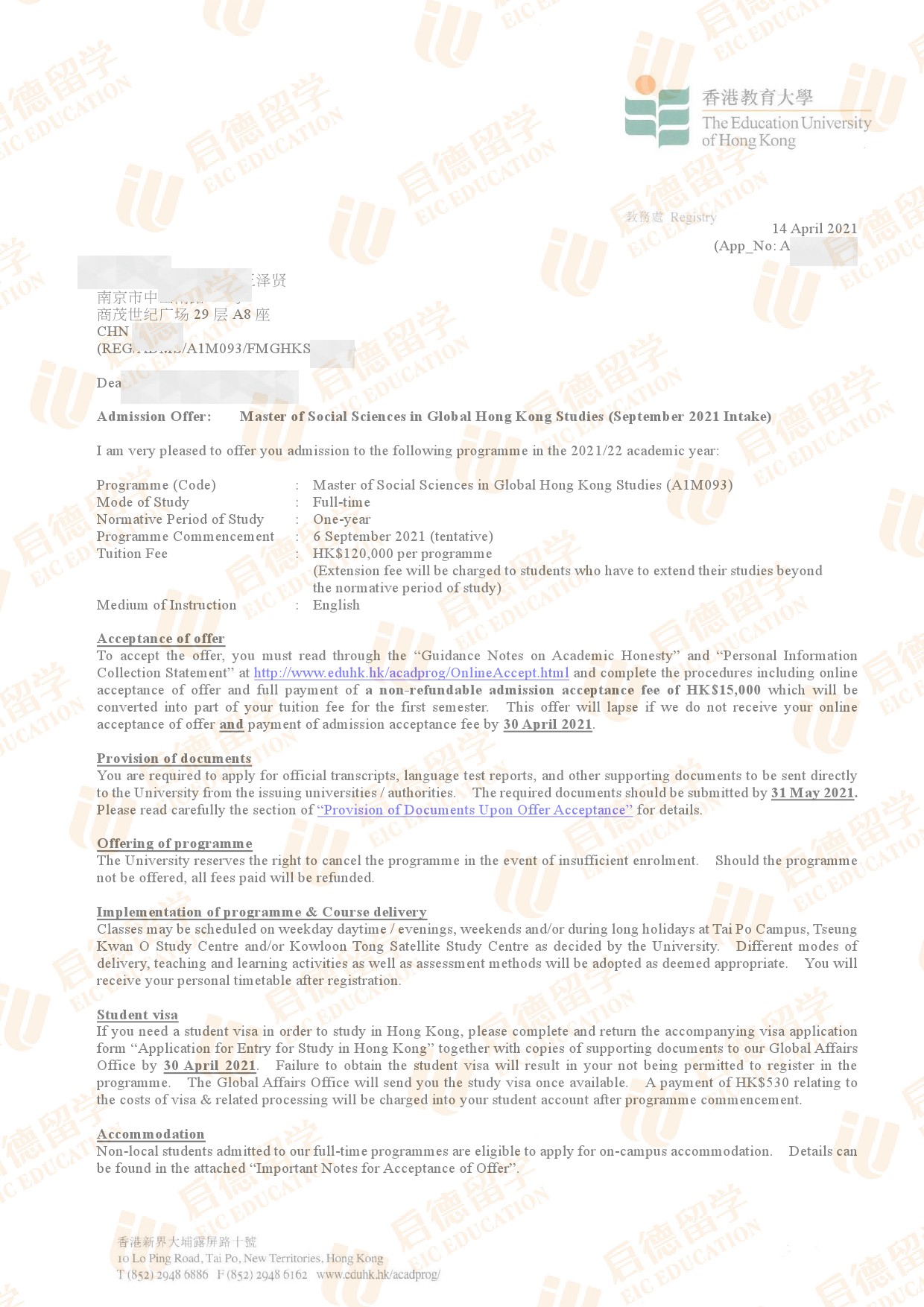 录取专业:Master of Social Sciences in Global and Hong Kong Studies