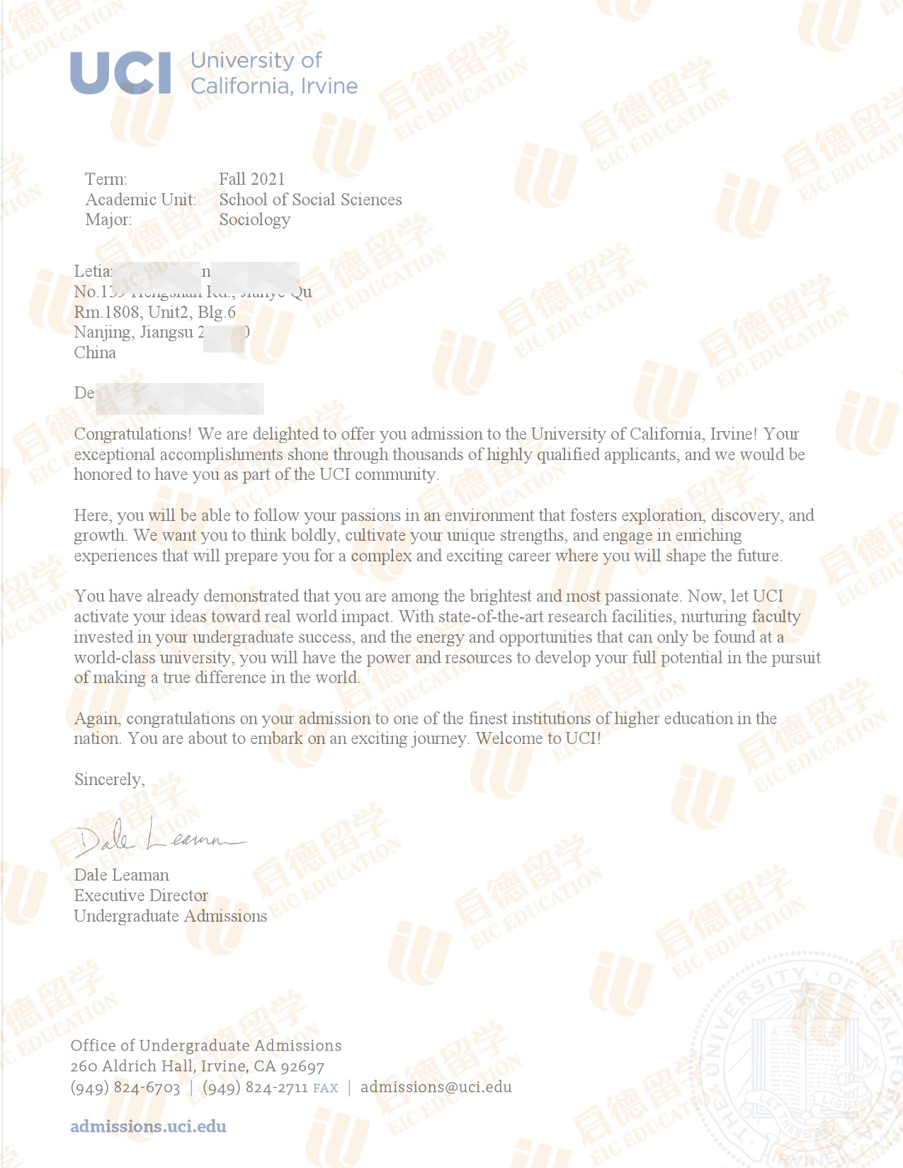 录取院校:加州大学欧文分校