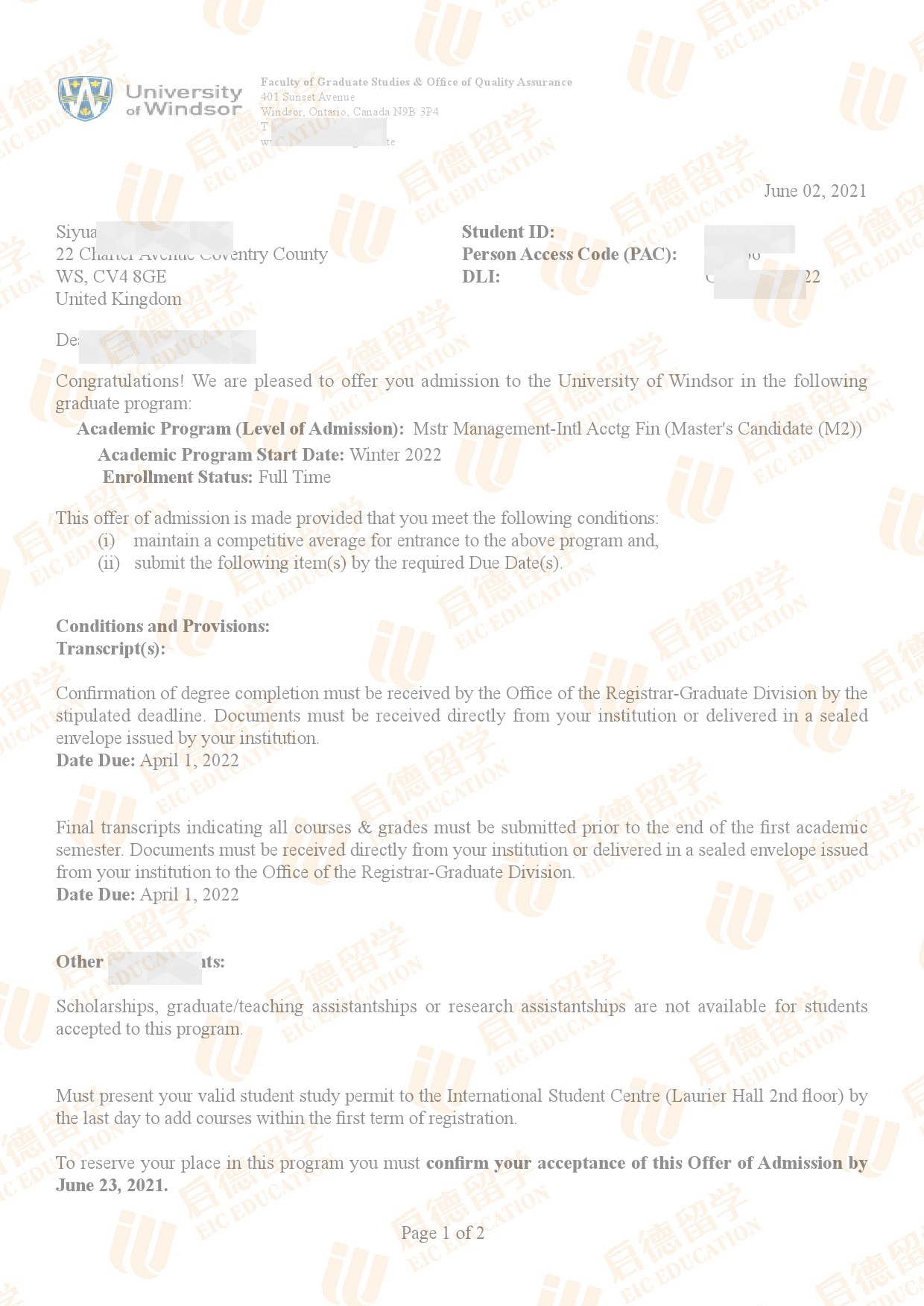 录取院校:温莎大学