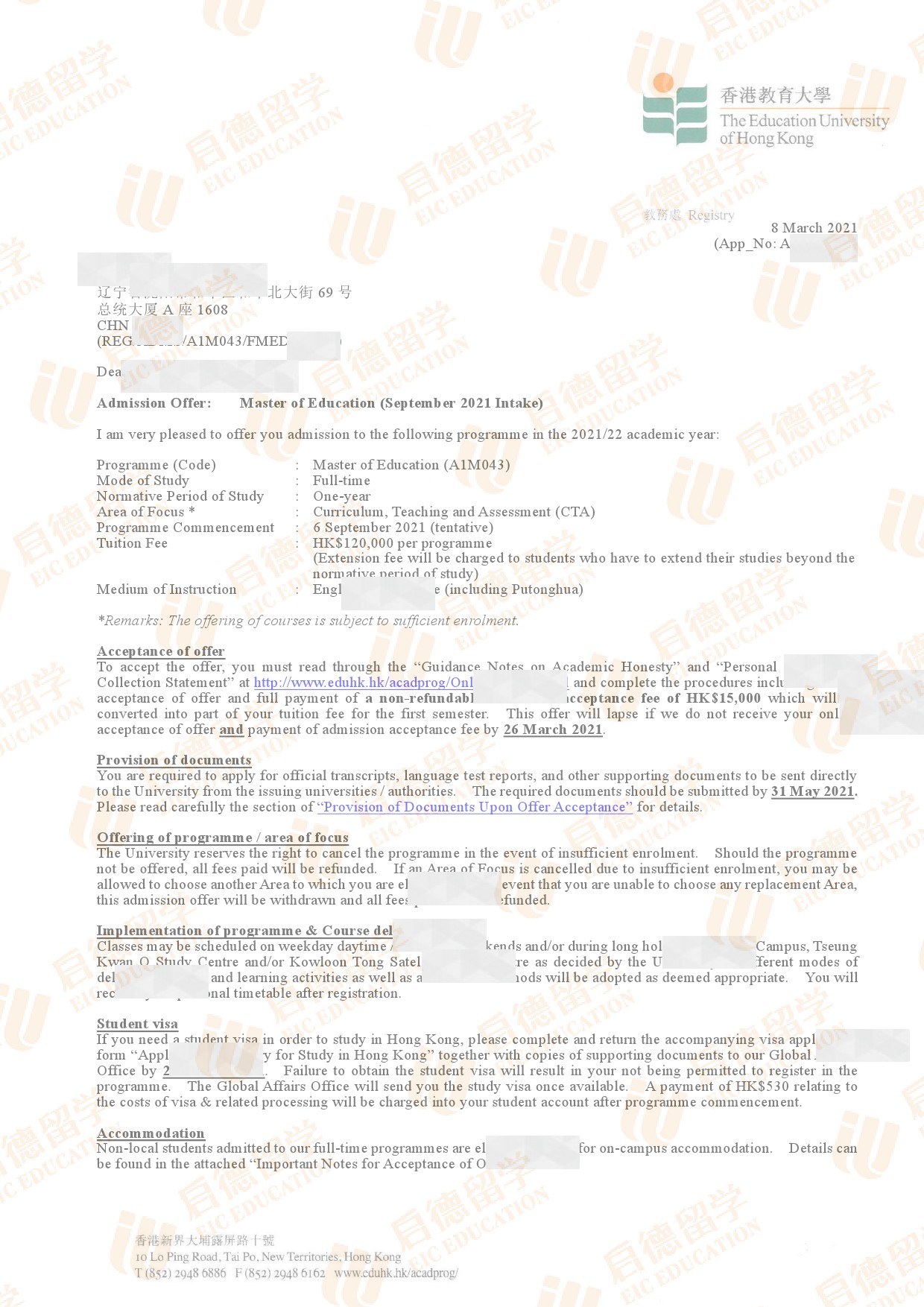 录取专业:Master of Education (Curriculum,Teaching and Assessment)