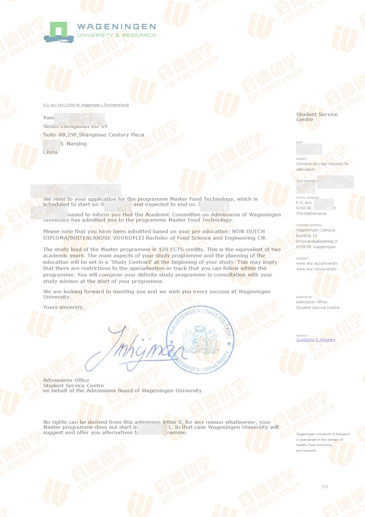 录取院校:瓦赫宁根大学