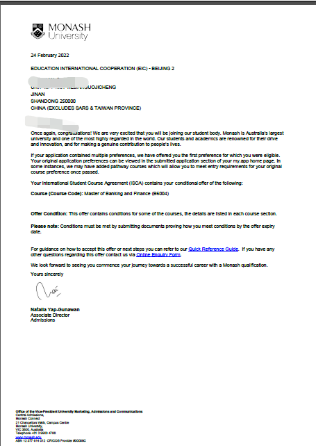 录取院校:蒙纳士大学
