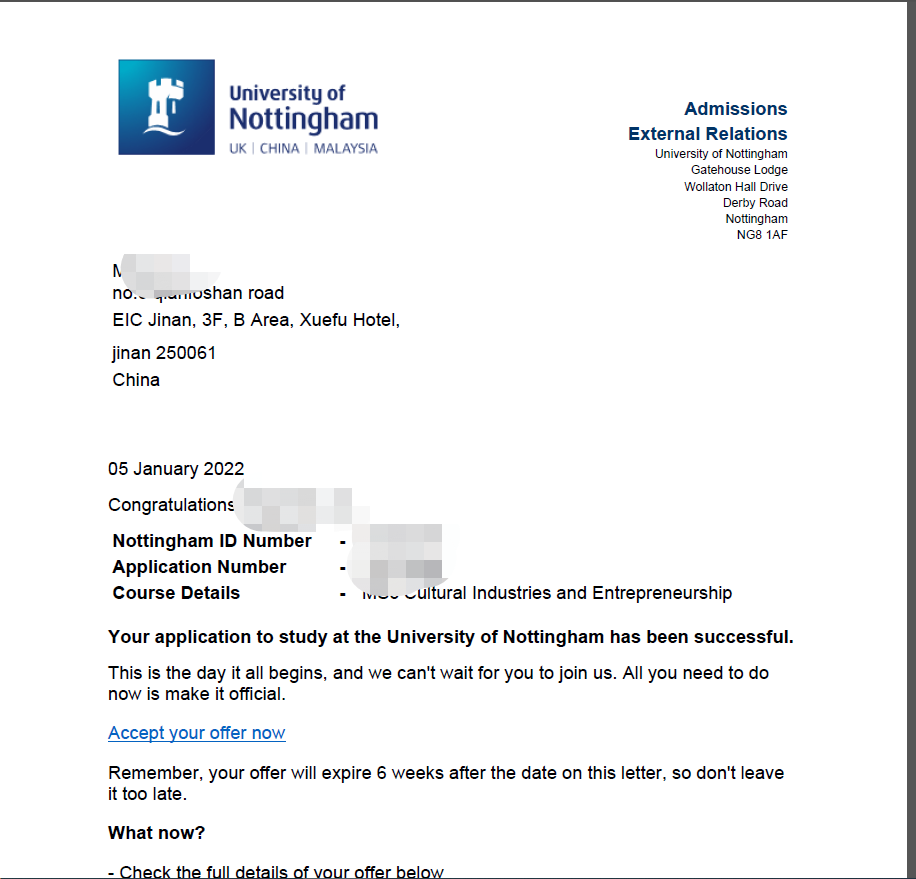 录取院校:诺丁汉大学