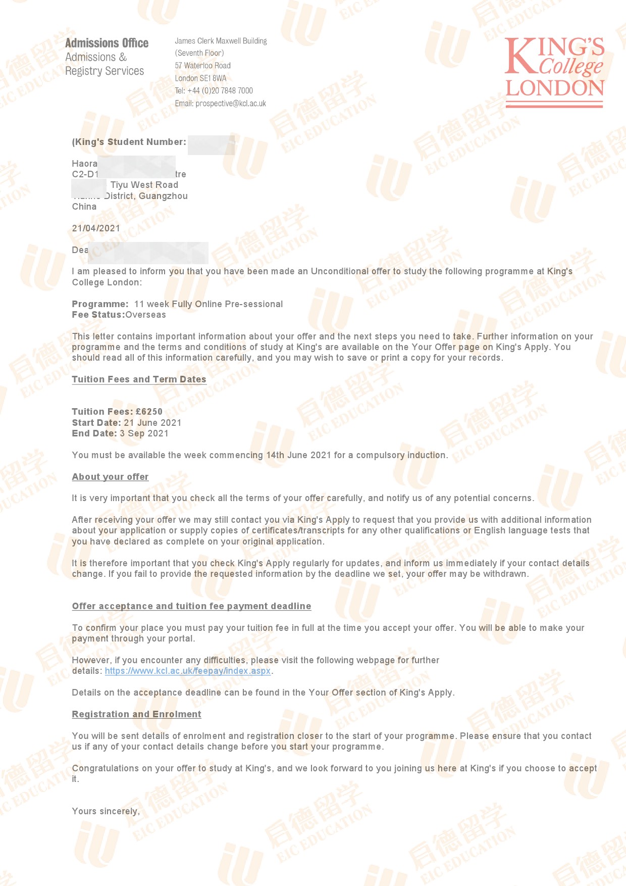 录取院校:伦敦大学国王学院