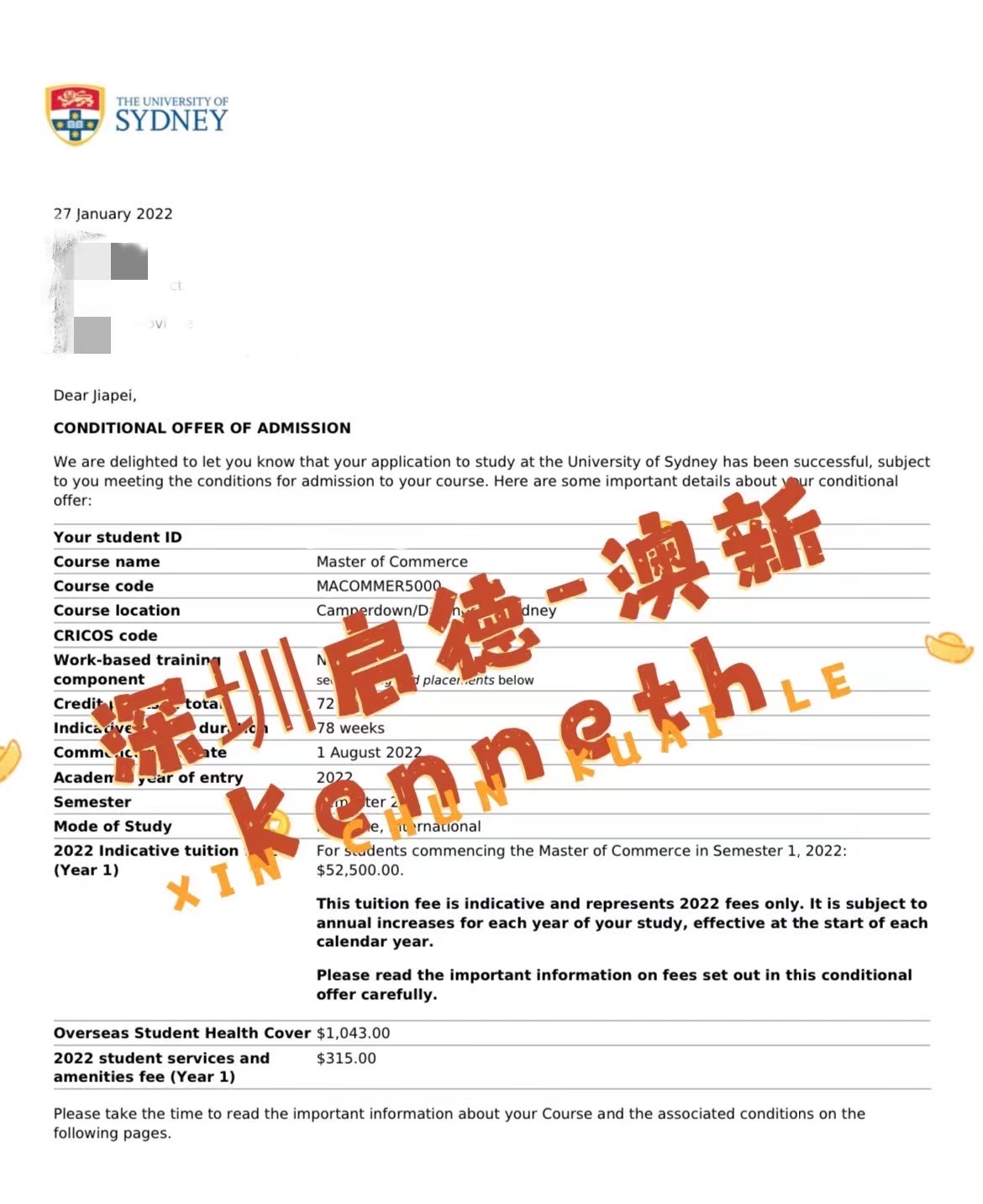 录取专业:Master of Commerce (Finance)