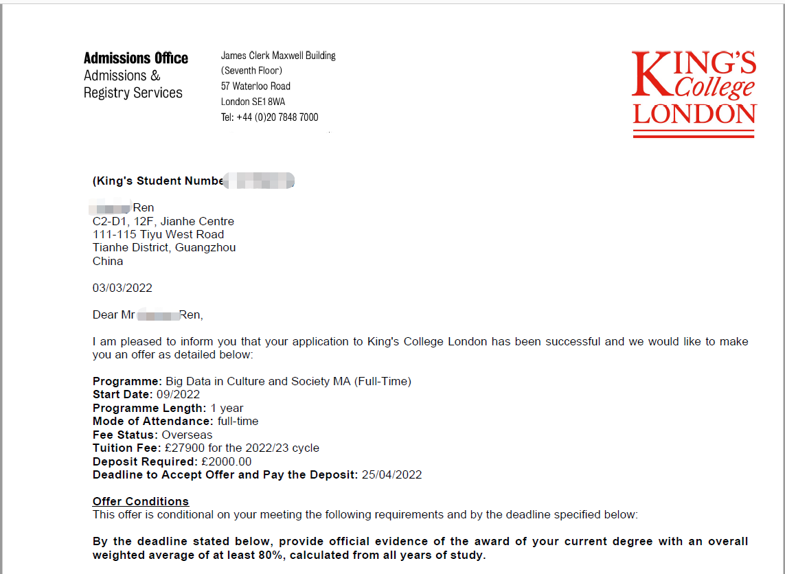 录取院校:伦敦大学国王学院