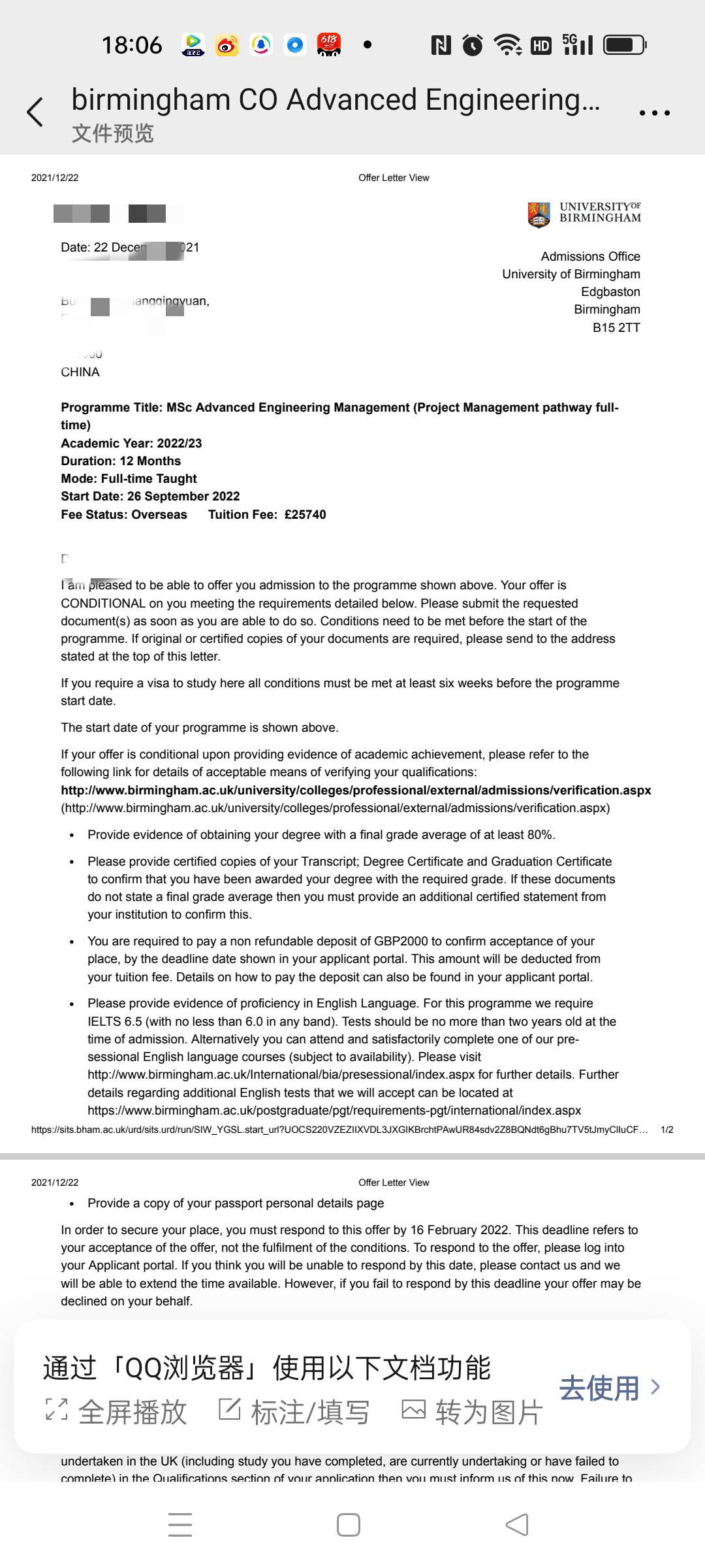 录取院校:伯明翰大学