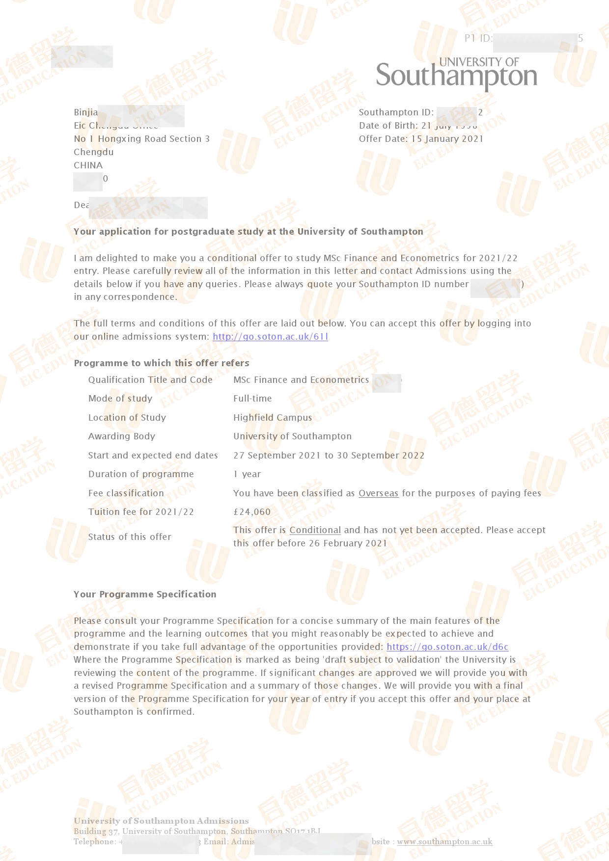 录取专业:MSc Finance and Econometrics