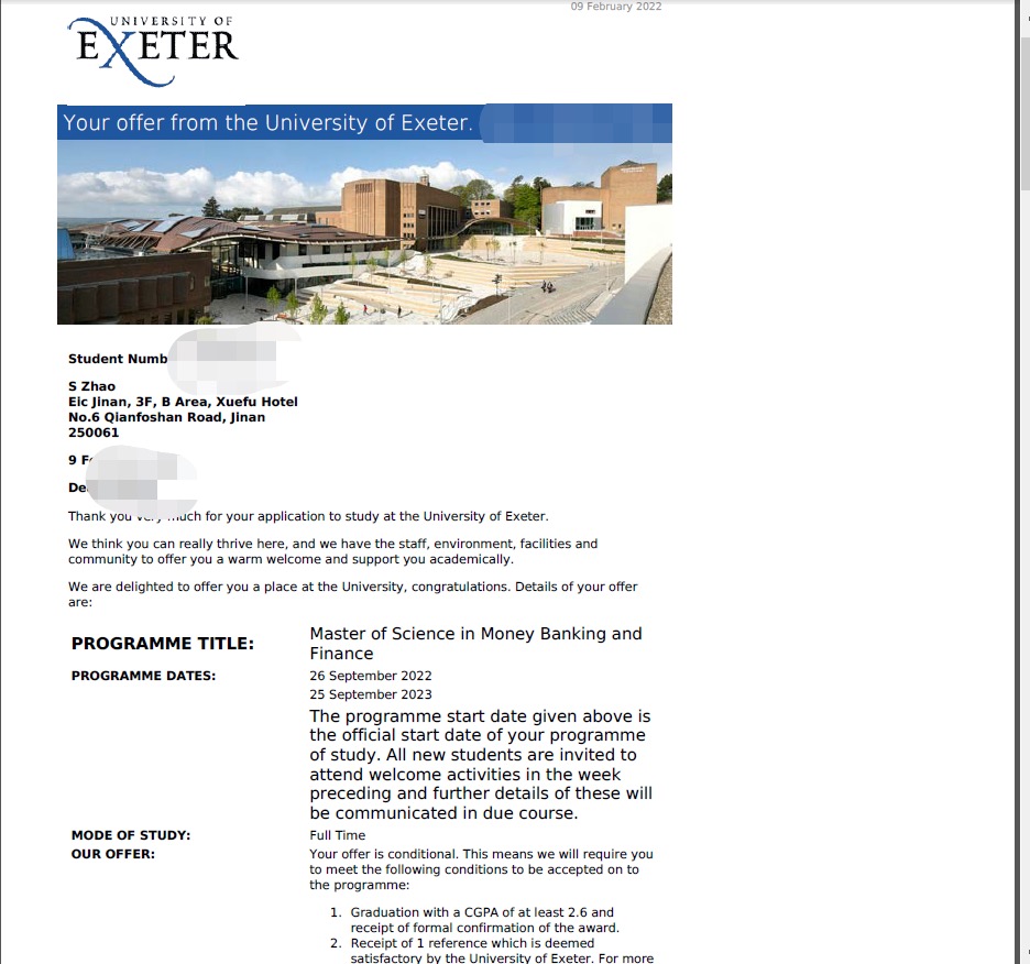 录取院校:埃克塞特大学