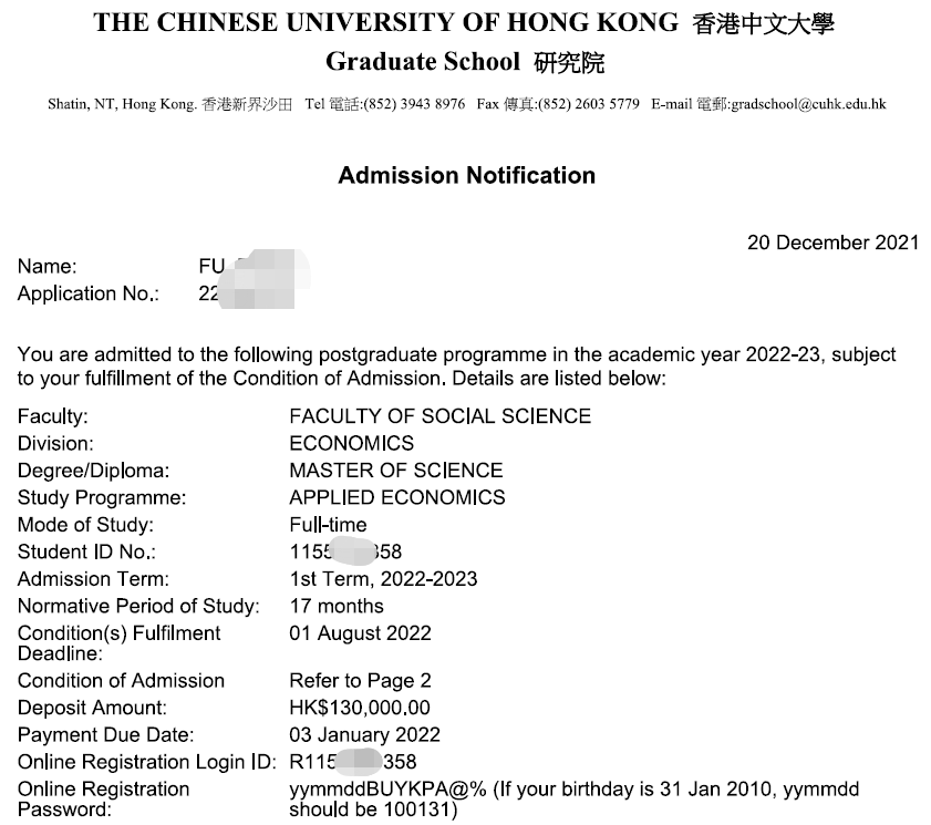 录取专业:Dual Degree - MSc in Applied Economics (CUHK) and MS in Social and Economic Policy (Northwestern University)