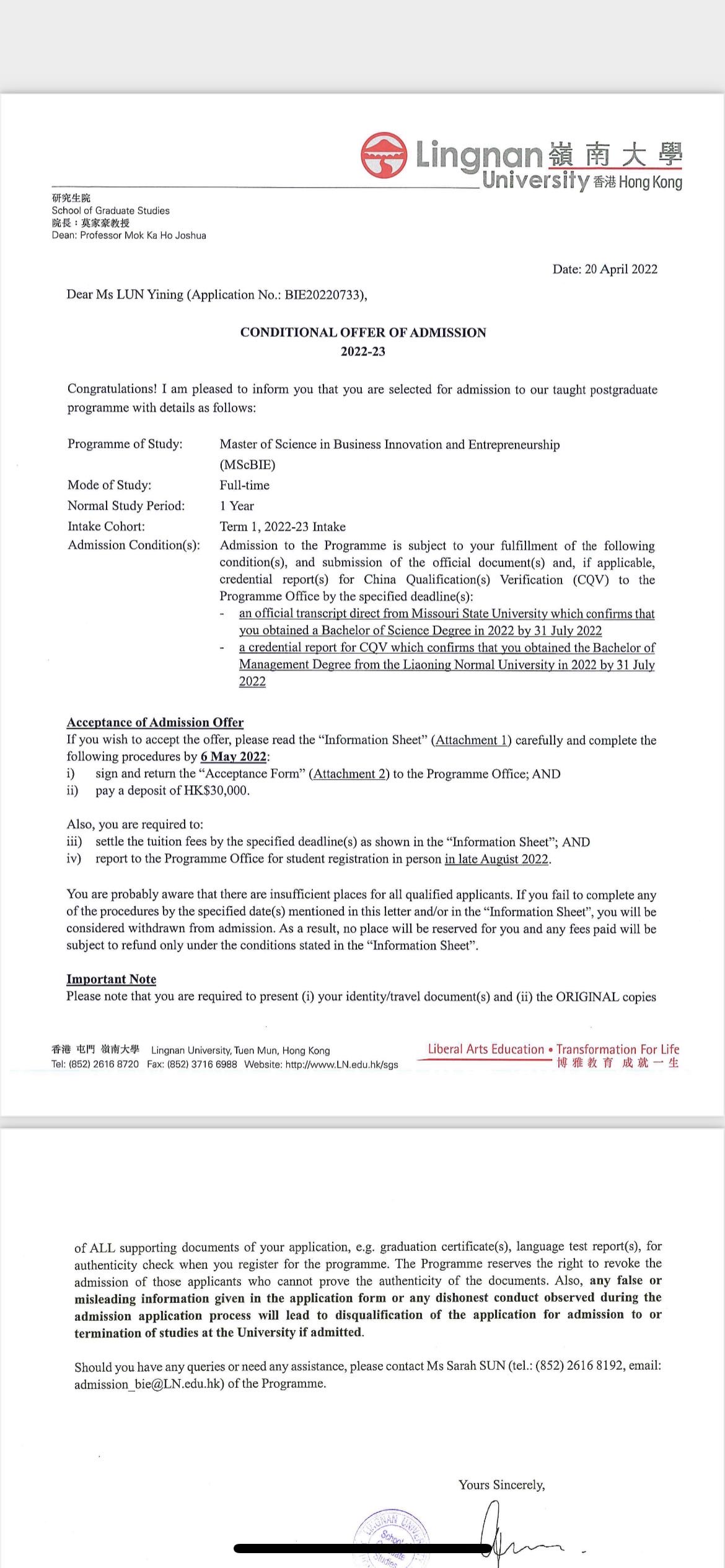录取院校:香港岭南大学