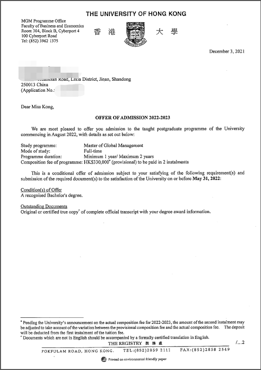 录取院校:香港大学