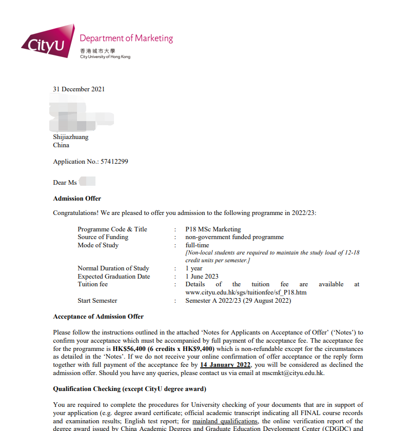 录取院校:香港城市大学