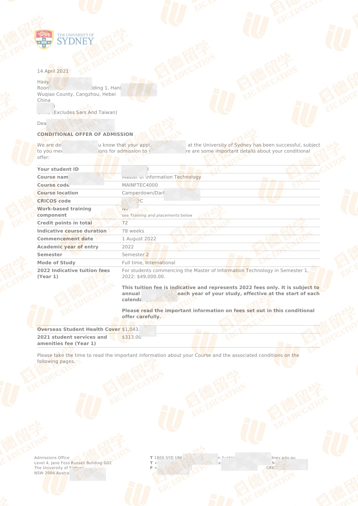 录取专业:Master of Information Technology