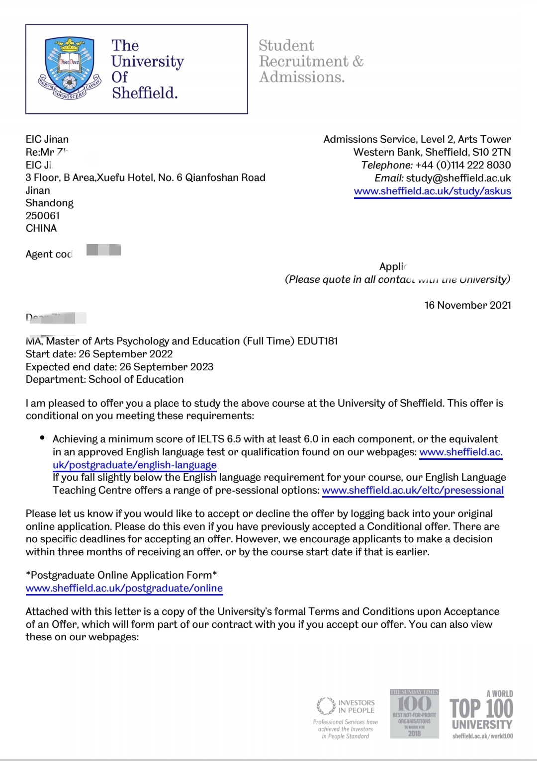 录取院校:谢菲尔德大学