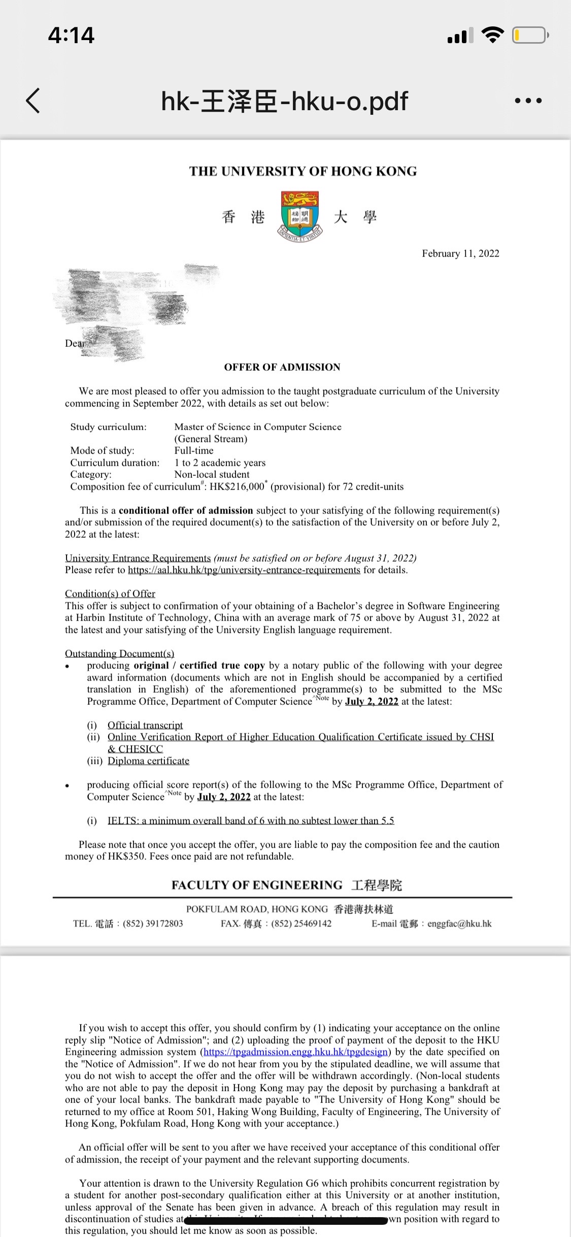 录取院校:香港大学