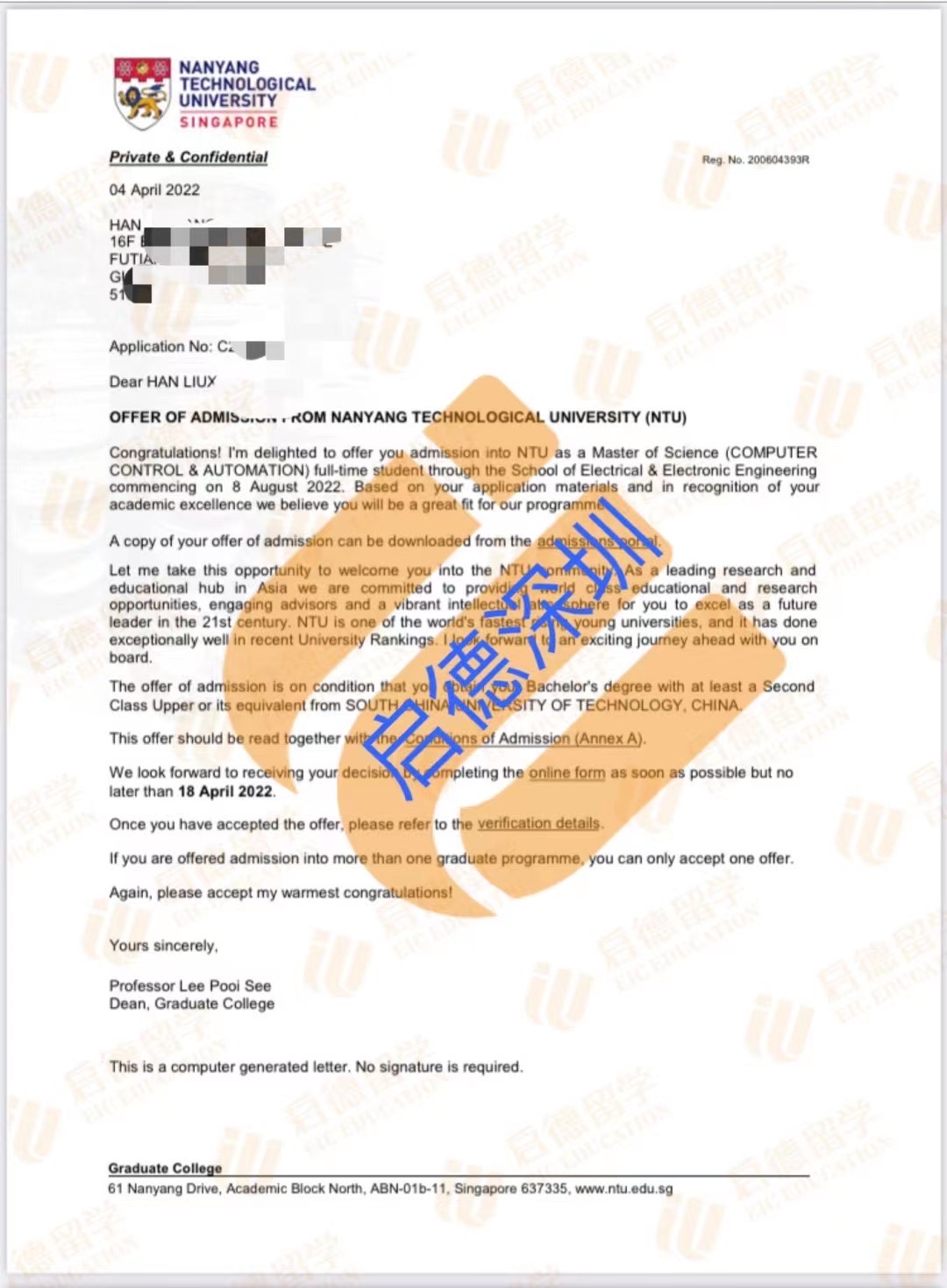 录取院校:新加坡南洋理工大学