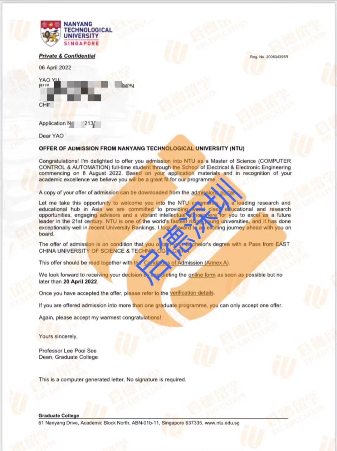 录取院校:新加坡南洋理工大学