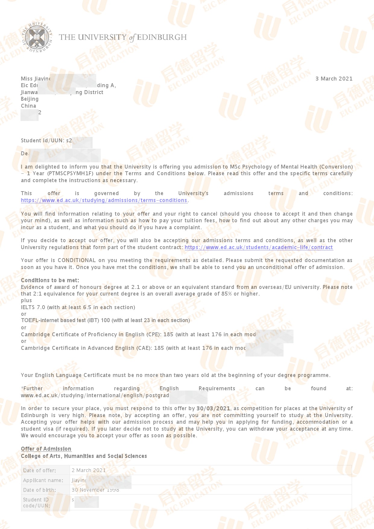 录取专业:MSc Psychology of Mental Health (Conversion)