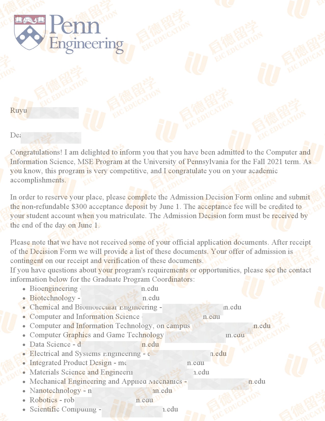 录取专业:MSE in Computer and Information Science