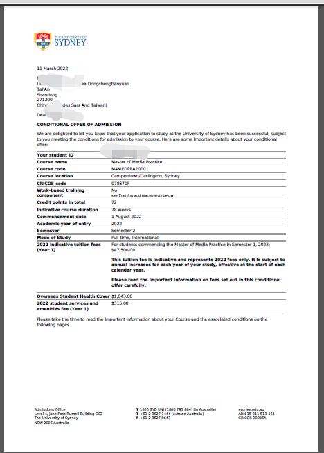 录取院校:悉尼大学