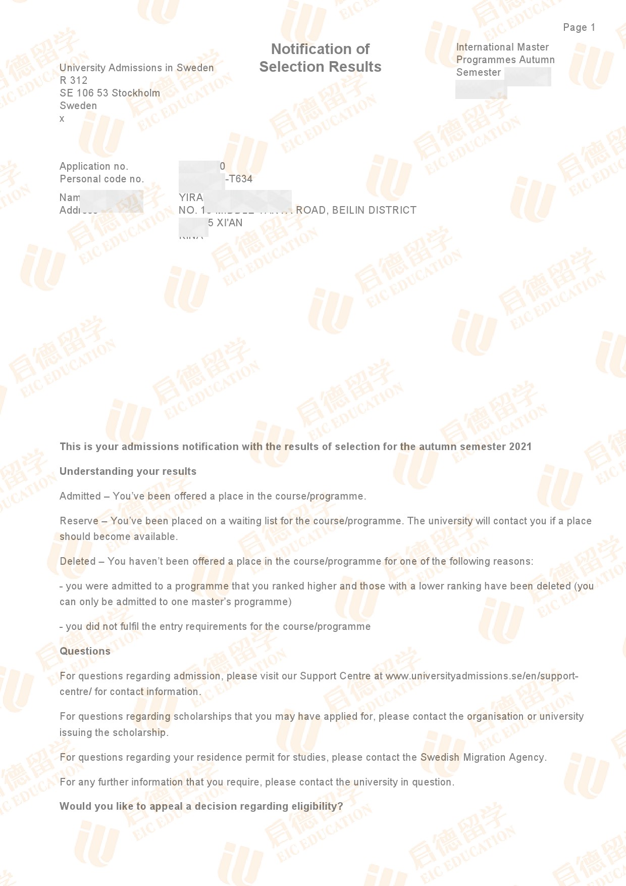 录取国家/地区:瑞典