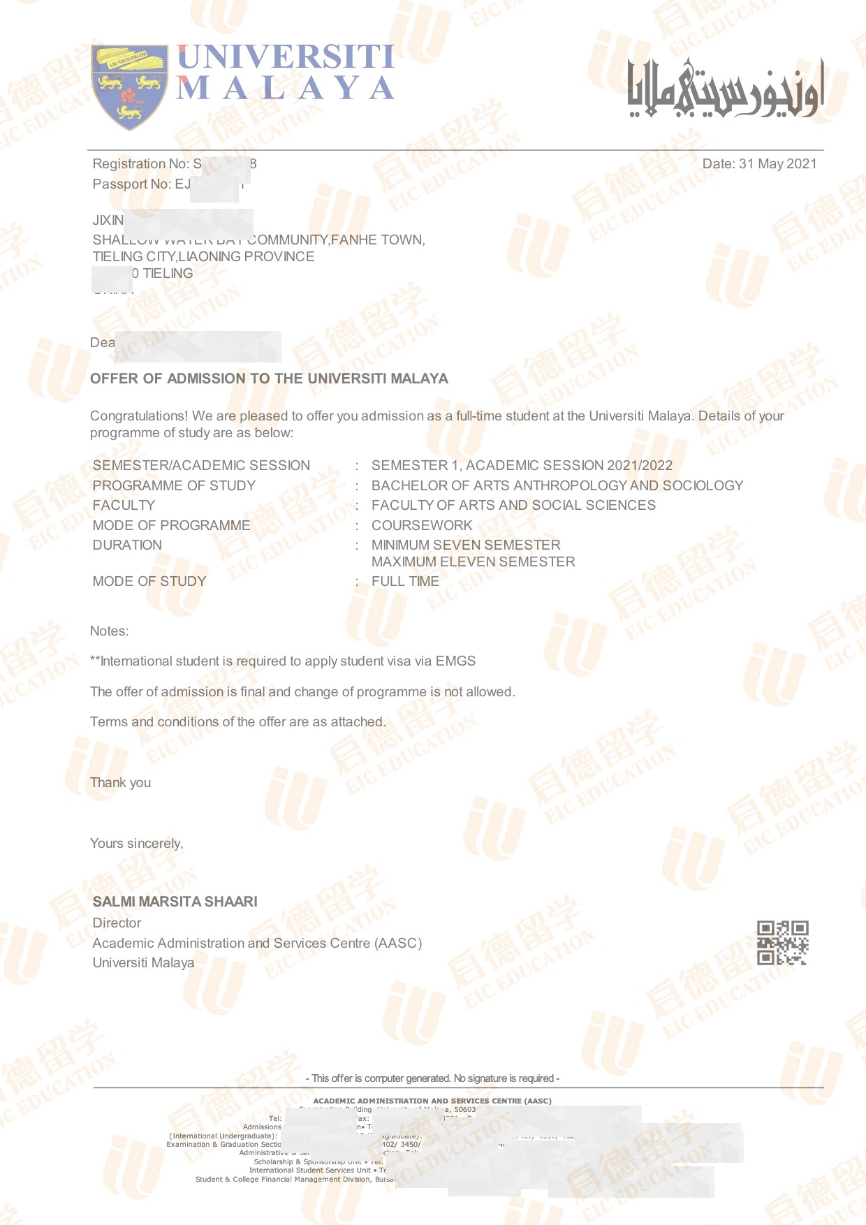 录取院校:马来西亚马来亚大学
