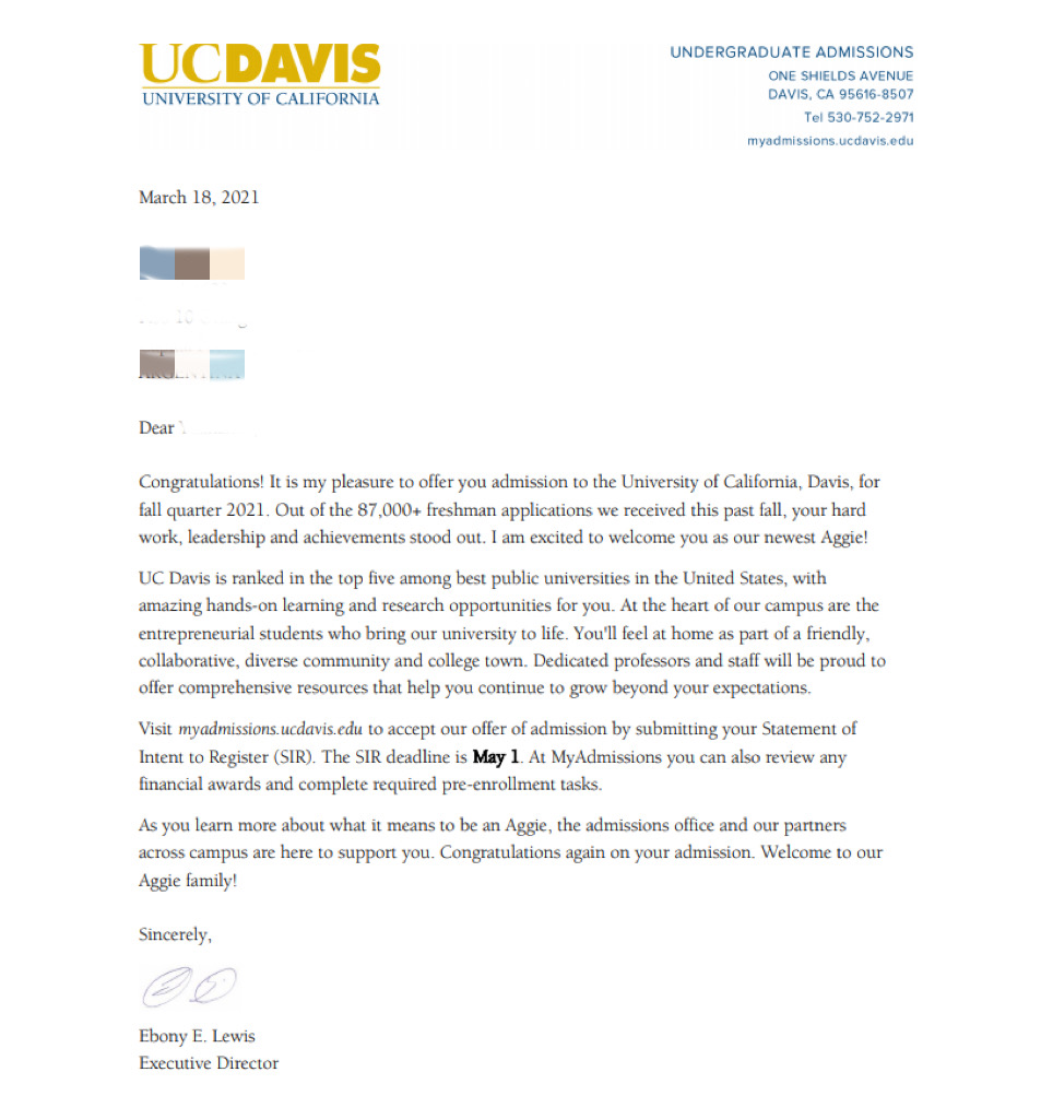 录取院校:加州大学戴维斯分校