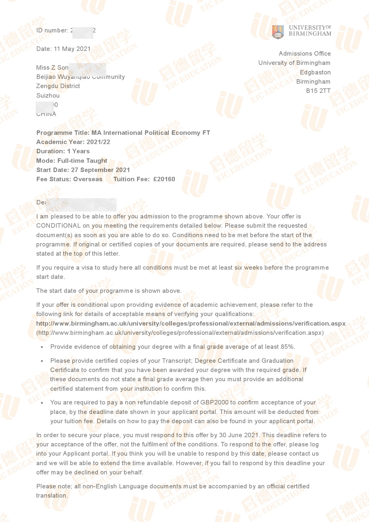 录取院校:伯明翰大学
